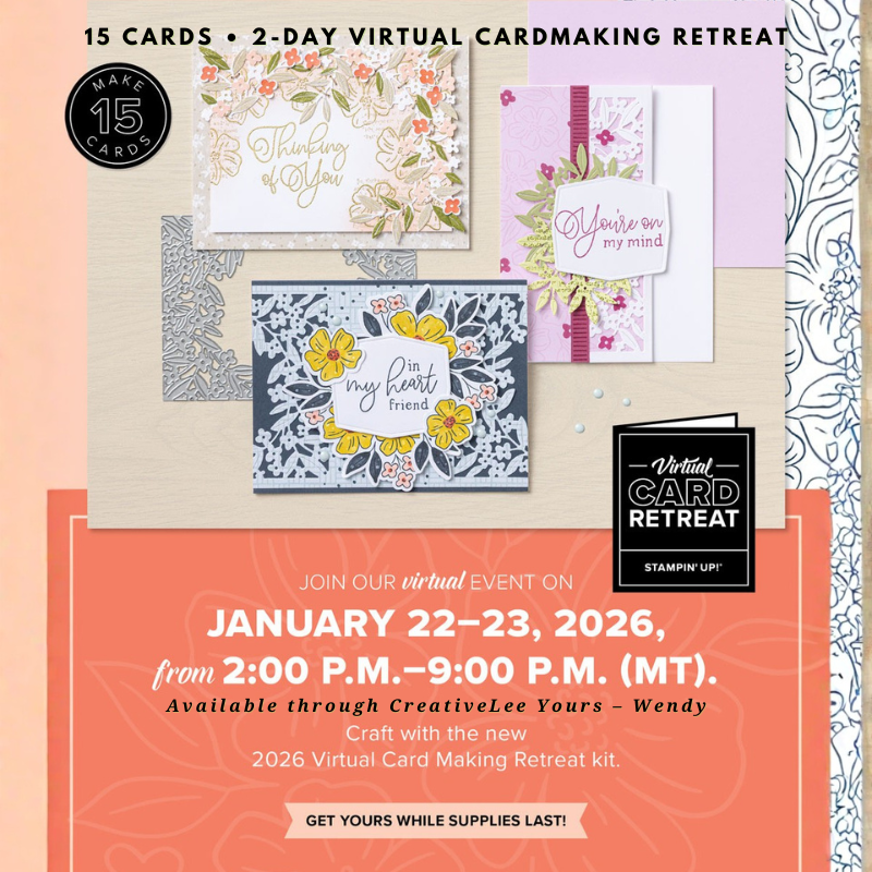 Stampin’ Up! is hosting a 2-Day Virtual Cardmaking Retreat in January where you’ll create 15 beautiful handmade cards in a guided, step-by-step experience—right from home. It’s a wonderful way to build confidence, learn new techniques, and enjoy the feel of a retreat without traveling.