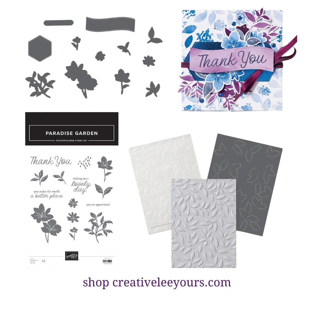 Our Make & Takes will all feature the “Paradise Garden” stamp set and Dies from our Online Exclusives. You can use any set you have, or add this on to your kit to be included.